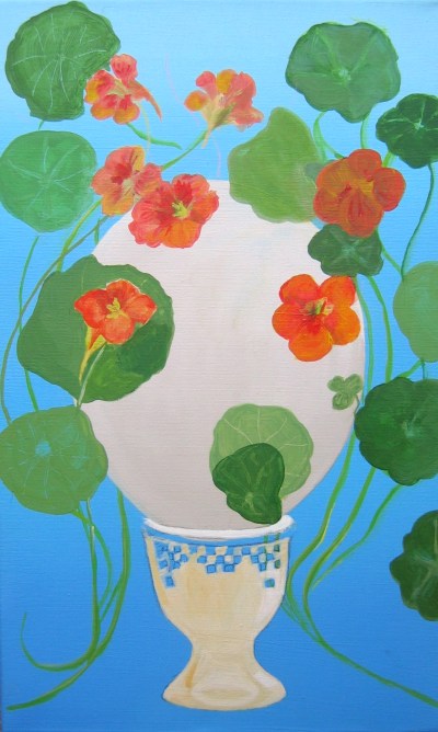 L'id�e est venue � Brigitte de transformer sa pomme en pommeau de douche. C'est venu comment ? association d'id�e typique de l'atelier du Pommier, et de la vivacit� d'esprit des participants � ces ateliers. Il faut dire que Brigitte avait d�marr� sur les chapeaux de roue, avec sa premi�re peinture Capucine (voir plus haut). A voir �galement un travail fait par TKI sur les memes s�quences d'exploration de l'acrylique: fond de ciel bleu, nuages, ballons.