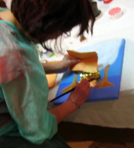 Voil� comment elle s'y prend pour appliquer une feuille dor�e sur l'oeuf pr�alablement enduite de la mixion (colle) |