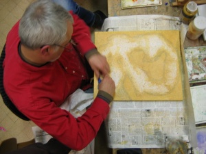 passion, la magie... (le chapeau haut de forme) Sont r�unis ici pas mal de difficult�s, (plis de tissus, perspectives, effets de mati�res, sable etc...) et Jean Pierre s'en sort bien, aid� d'une d�termination d'acier tremp�, et d'une humeur joviale qui fait si grand bien � notre s�ance du jeudi soir ! Vraiment bien pour quelqu'un dont c'est ici ses premiers pas en peinture, n'est ce pas ?