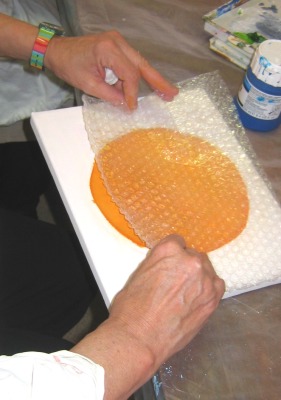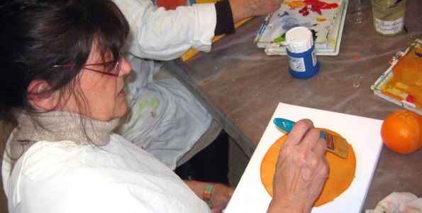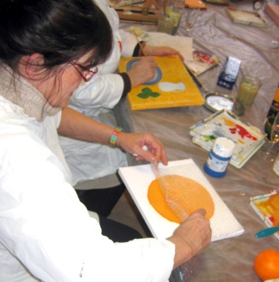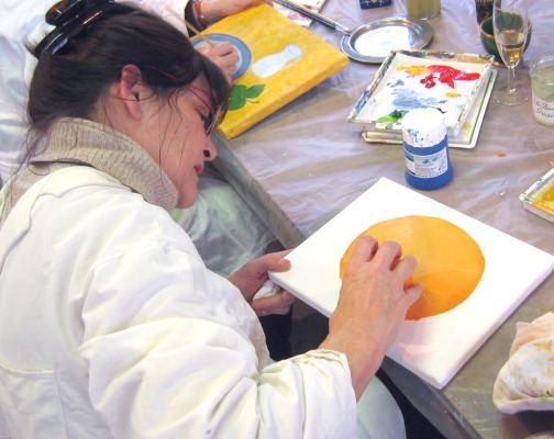 Elle fera plusieurs études, pour les vertus de l'expérimentation de la peinture acrylique. Ici un diptyque pour comparer le grain d'un ballon de basquet avec celui d'une orange. (à suivre...) |