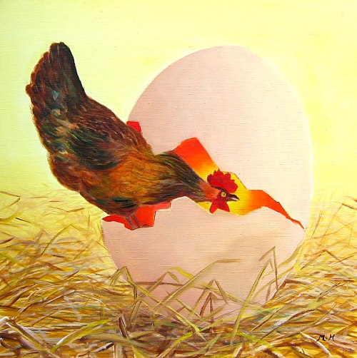 Mon triptyque poules, 2005 : Deux carrés 30 x 30 cm et un carré 60 x 60 cm. Effet de cadre en bois en trompe-l'œuil. |