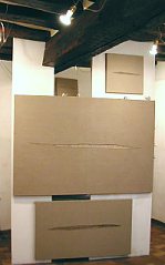 Cette série est accompagnée d’une installation constituée de petits dromadaires obtenus par simple découpage de boîtes à oeufs. Ces modules rigolos, sortes de marqueurs identitaires, renvoient à mon premier travail et participent à son épuisement. Erosion artificielle obtenue, ici encore, par la répétition d’un geste. L’accumulation de ces modules est plutôt un travail rébarbatif mais néanmoins nécessaire au jeu qui m’amuse : jeu de composition utilisant les rapports créés entre les différents éléments et l’espace qui les contient. |