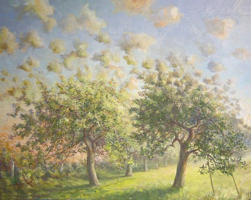 In March, traditionally, I paint orchards. Being unsure of the exact moment when they will burst in white flowery panaches, I visit them often. Back home I sometimes take liberty with the calendar, and , like for this one, I imagine them already ripe for a delicious early morning promenade. Here, I was hurrying to complete a painting that I intended to be showcased in the annual Pontoise Art show. This year, the event is placed under the centennial anniversary of the Camille Pissarro death. Two years ago, I had the opportunity to work for a few months in his Eragny-sur-Epte Studio. There I worked around the apple trees growing wild in his abandoned garden. (see the Eragny-sur-Epte Page) |