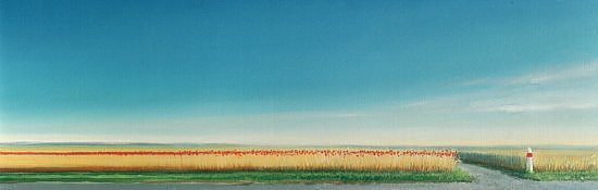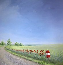 Je suis de retour en France. L'été s'en va déjà. . Vers la fin juillet, je parcours les petites routes du Vexin à la recherche du fragile coquelicot. Je vous montre ici trois des sept peintures que j'ai faites, dans l'intention un peu sadique de les mettre en rang, à la règle. Vous verrez ici plusieurs essais avec des balises routières ou de travaux.. |